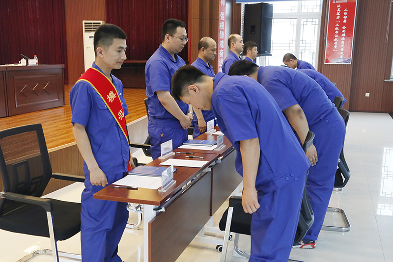 儀式上,結(jié)對(duì)師徒鄭重地在師徒協(xié)議上簽字,徒弟向師傅鞠躬行拜師禮,師傅向徒弟贈(zèng)送學(xué)習(xí)筆記本并寄語鼓勵(lì)。