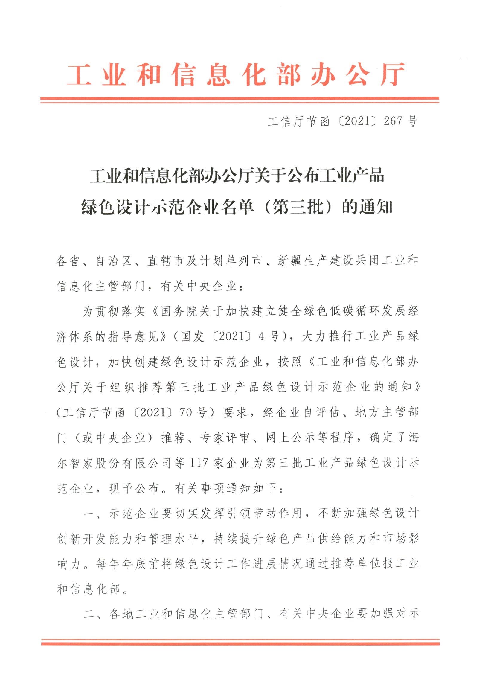 佳電股份積極強化綠色設(shè)計創(chuàng)新開發(fā)能力和管理水平,持續(xù)提升綠色產(chǎn)品供給能力和市場影響力,于2021年11月,被國家工業(yè)和信息化部評為國家級“綠色產(chǎn)品設(shè)計示范企業(yè)”,成為黑龍江省唯一一家入選第三批工業(yè)產(chǎn)品綠色設(shè)計示范企業(yè)。